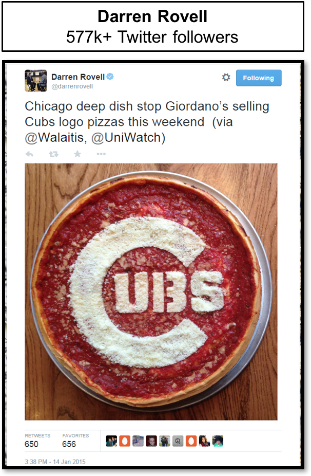 “Executing the Cubbies Pizza initiative during Cubs Convention weekend allowed us to bring our pizza to Cubs fans in a new light, sharing our personality and introducing a new reason to interact with our product. These types of added valuable opportunities are invaluable and key to a successful partnership. As a result of the Cubbies Pizza, Giordano’s saw millions of media impressions, enhanced customer engagement and extremely healthy same store sales growth – all from an idea that wasn’t even a contractual element.”