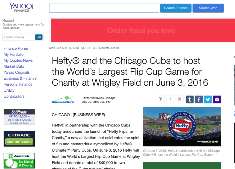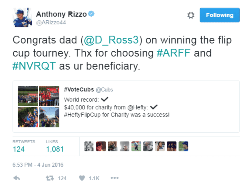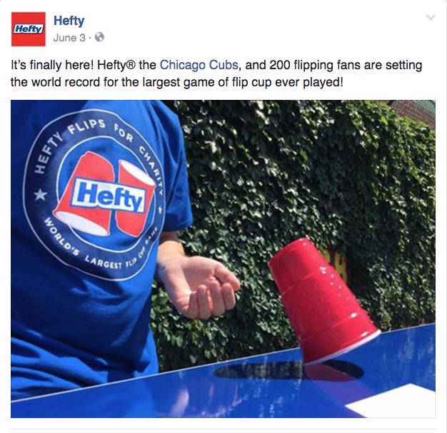 Orchestrate the world’s largest flip cup game in the outfield warning track of Wrigley Field following the June 3rd game vs Arizona. The game, which will feature a total of 200 participants, will be captained by two current Cubs players. Each participant will be able to register on a unique Cubs.com page and received up to 2 tickets compliments of Hefty.